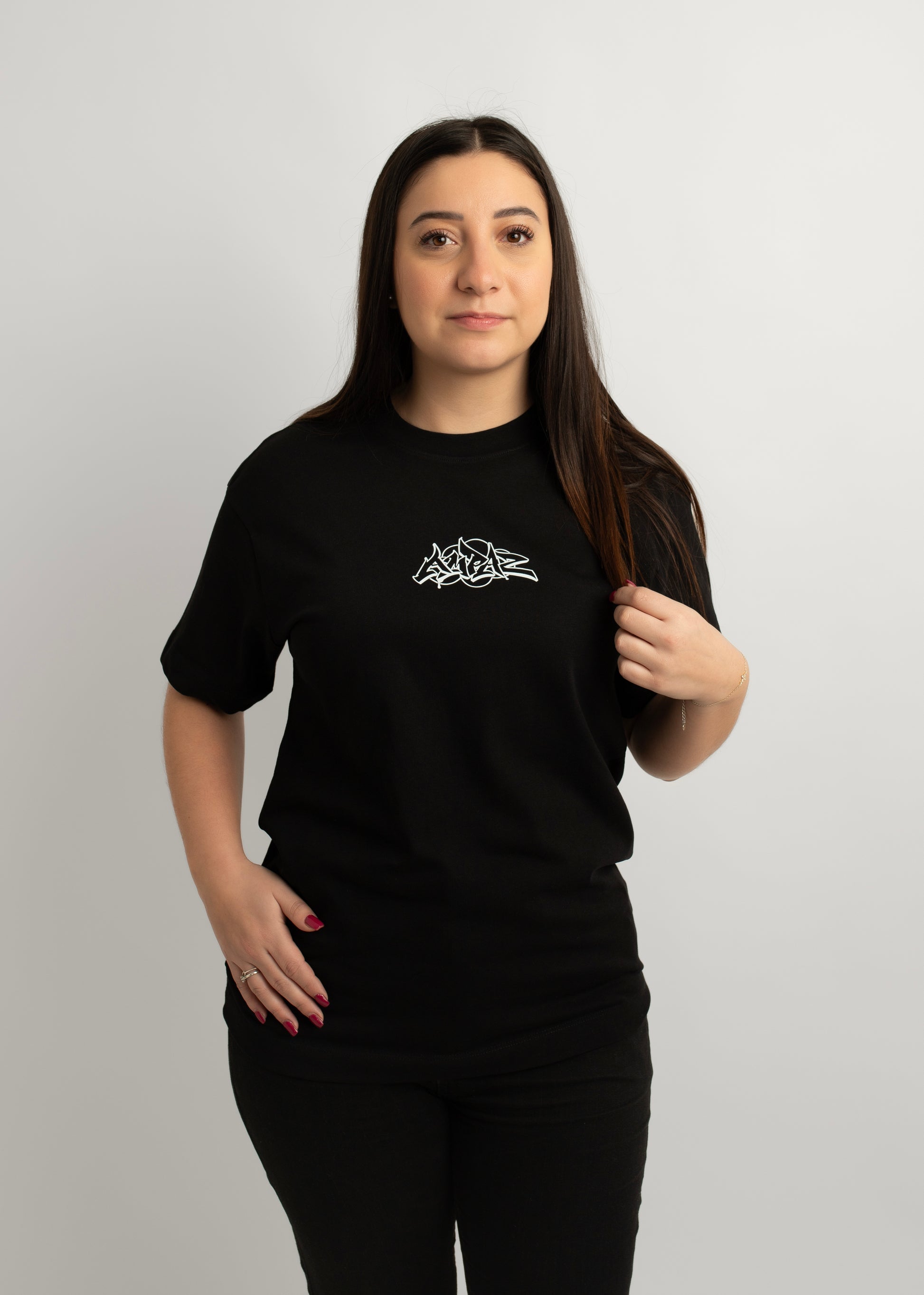 Notre modèle féminin Olivia mesure 1m58 et porte le t-shirt noir en taille XS.